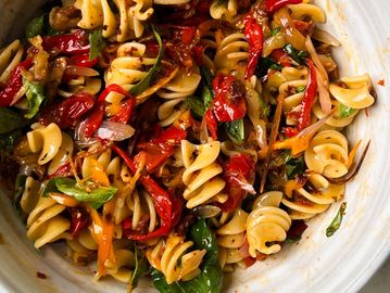 Rotini pasta garnished with roasted peppers and tossed in our favorite dressing